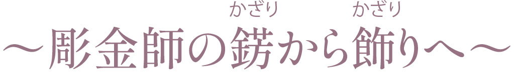 錺金具は職人が鏨を使い一つ一つ打ち込んで創り出す静寂の中に息ずいている美しい伝統紋様です。日本古来の錺金具の技術を生かし現代の飾りへ想いを込めて、伝統を日常にお届けします。